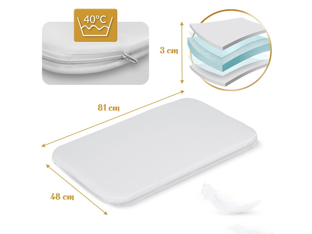Matrac s rozmermi 81 × 48 cm zabezpečuje vhodnú oporu a pohodlie pre dieťa.