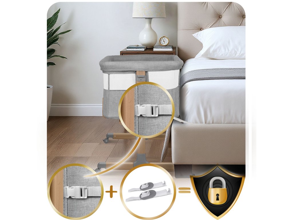 Stabilné a ľahko montovateľné zabezpečovacie popruhy zabezpečujú pevné spojenie postieľky s posteľou rodičov.