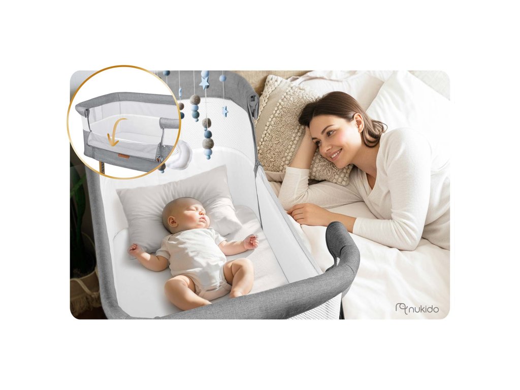 Detská postieľka overenej značky NUKIDO zabezpečuje dieťaťu bezpečný priestor na spánok. Dieťa je blízko rodičov, čo uľahčuje budovanie väzby a zabezpečuje pocit bezpečia.