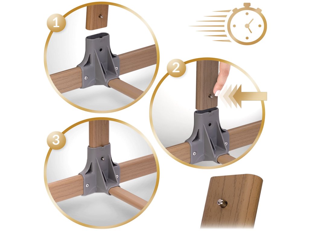 - Vďaka systému „Quick Click” s pripojením na západku, montáž a demontáž konštrukcie je mimoriadne rýchla a jednoduchá, čo uľahčuje skladovanie a súčasne umožňuje použitie produktu na cestách. Pevné spoje zaručujú silnú, stabilnú a bezpečnú konštrukciu, vhodnú pre deti.