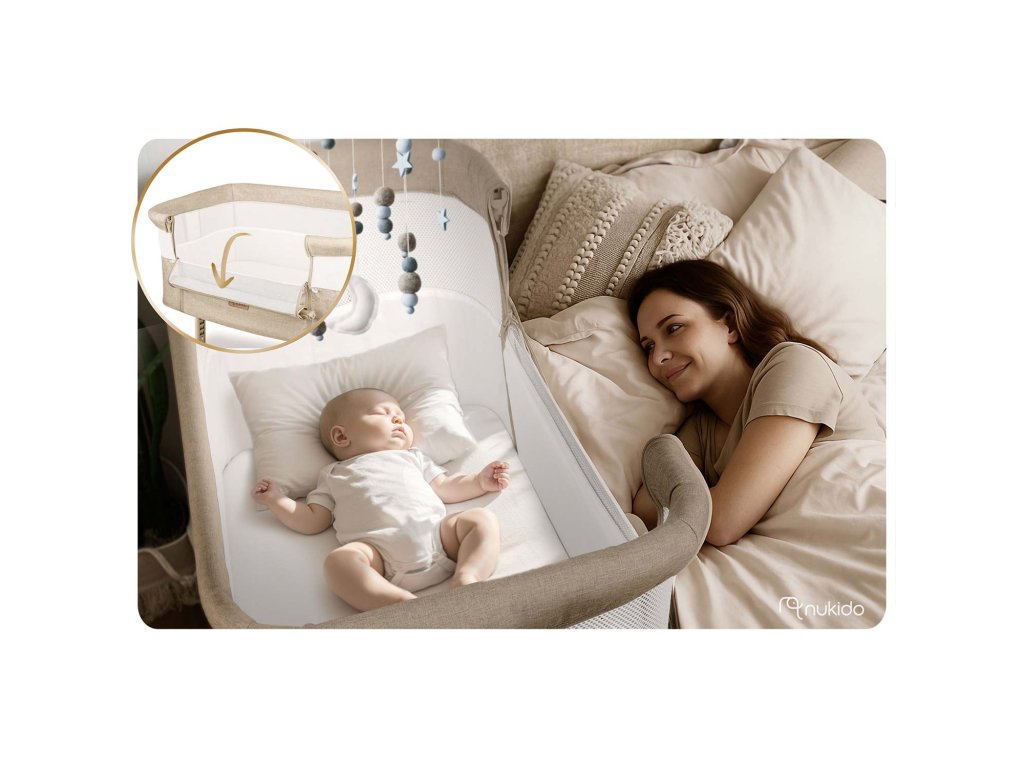 Prístelková postieľka overenej značky NUKIDO zabezpečuje dieťaťu bezpečný priestor na spanie. Malý je blízko rodičov, čo uľahčuje budovanie väzieb a zabezpečuje pocit bezpečia.