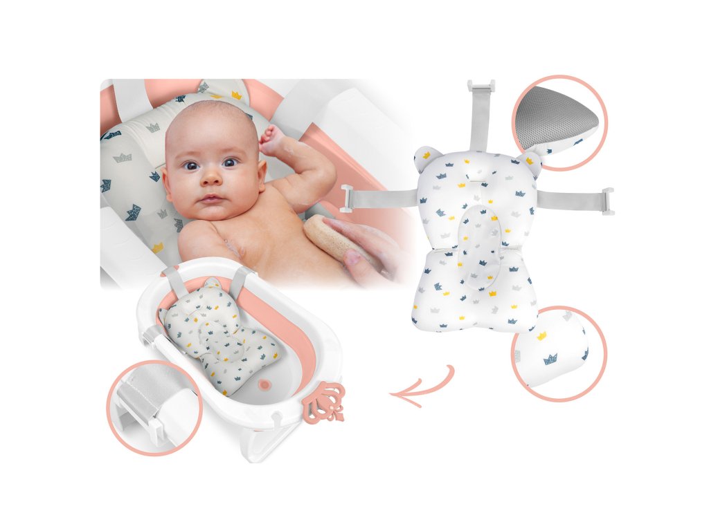 V balení s vaničkou dostanete jemnú, tvarovanú vložku, ktorá jemne podopiera hlávku a chrbátik dieťaťa. Vďaka trom pevným úchytom ju upevníte bezpečne na okraji vaničky – bez skĺznutia, bez stresu. Vložka je vyrobená z rýchloschnúceho materiálu, takže po kúpeli ju vyberiete a odsajete v okamihu. Maximálny komfort a hygiena počas každej chvíle strávenej vo vode!