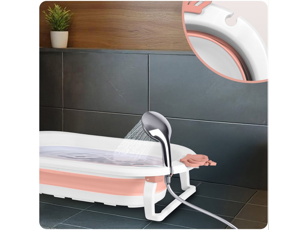 Vďaka vstavanému držiaku na sprchovú hlavicu sa kúpanie stáva mimoriadne pohodlné a bezpečné. Stabilne upevnená hlavica umožňuje voľné nalievanie vody bez špliechania – stačí nastaviť vaničku, naliať presne toľko, koľko je potrebné, a nasmerovať prúd pod správnym uhlom.