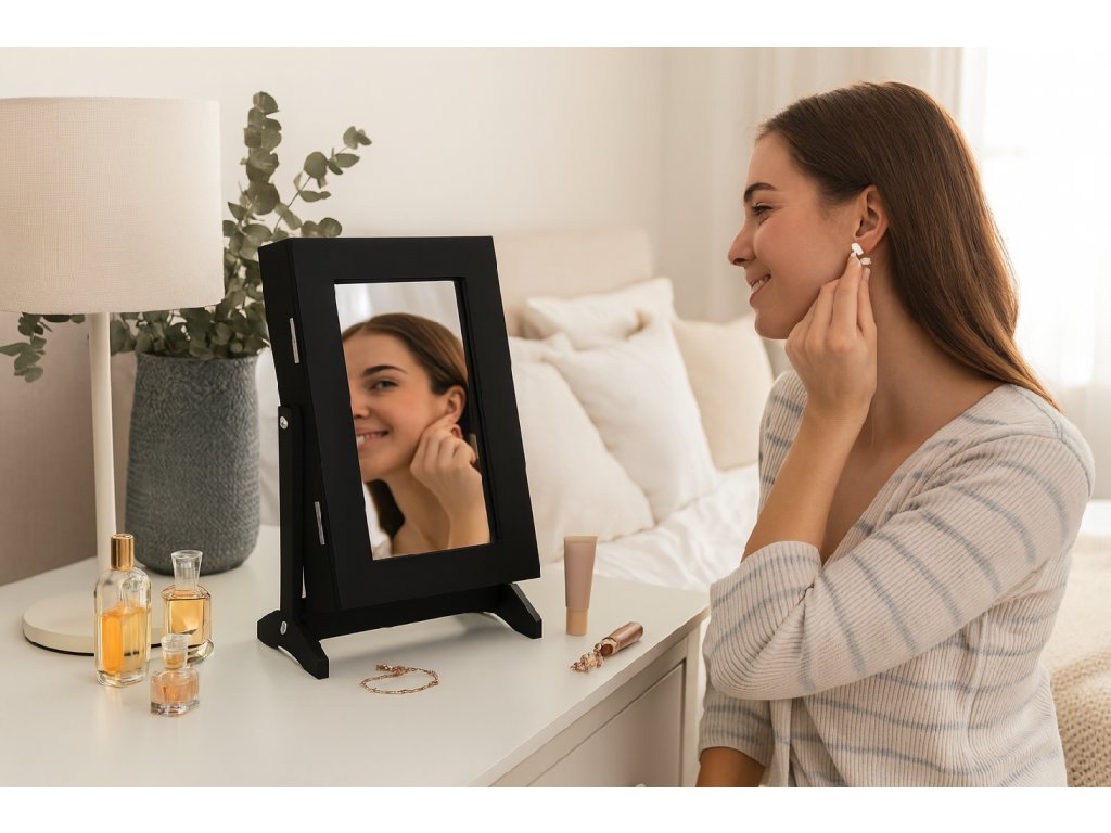 Skrinka na šperky so zrkadlom je výnimočný doplnok do vášho interiéru. Ochrání vaše poklady, zabezpečí im elegantnú expozíciu a uľahčí každodenné prípravy. ???? To je investícia do poriadku, pohodlia a krásy – a pri tom skvelý nápad na darček, ktorý očarí každú ženu. ??