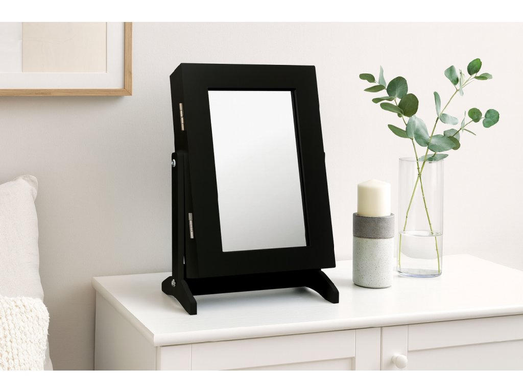 Elegantná čierna skrinka na šperky so zrkadlom. Kompaktná a štýlová, s čalúneným interiérom, háčikmi a poličkami. Ideálna do spálne a šatníka, poskytuje poriadok a ochranu šperkov.