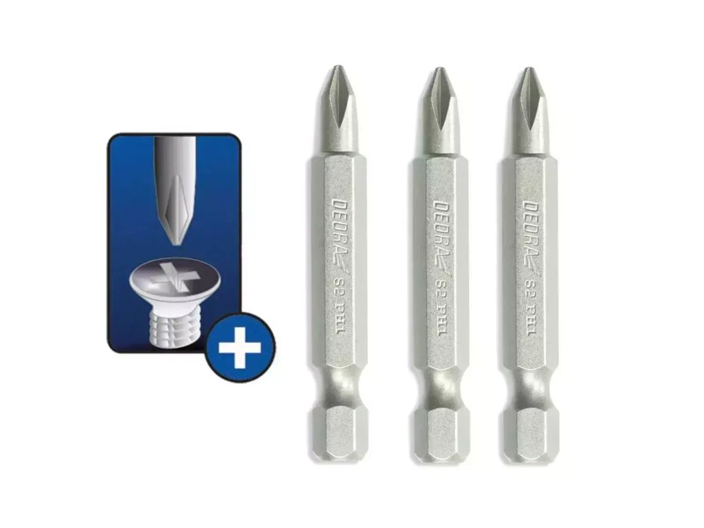 Skrutkovacie bity PH2. Bity sú vyrobené z ocel e S2, ktorá sa vyznačuje vysokou tvrdosťou a odolnosťou voči nárazom. Vďaka chemickému zloženiu a tepelnému spracovaniu si bi ty dlhodobo zachovávajú svoje vysoké pevnostné vlastnosti.