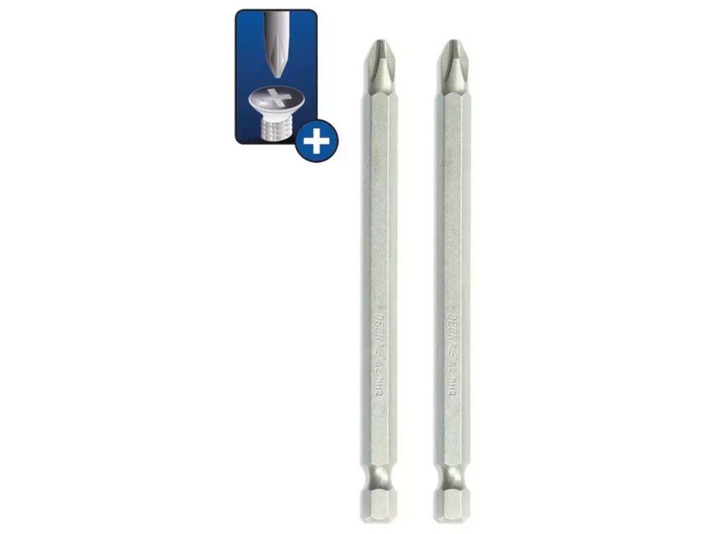 Skrutkovacie bity PH2. Bity sú vyrobené z ocele S2, ktorá sa vyznačuje vysokou tvrdosťou a odolnosťou v oči nárazom. Vďaka chemickému zloženiu a tepelnému spracovaniu si bity dlhodobo zachovávajú svoje vysoké pevnostné vlastnosti.