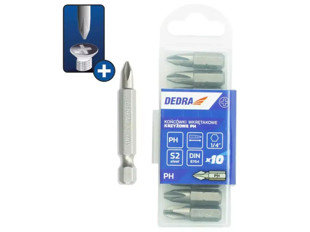 Skrutkovacie bity PH2. Bity sú vyrobené z ocele S2, ktorá sa vyznačuje vysokou tvrdosťou a odolnosťou voči nárazom. Vďaka chemickému zloženiu a tepelnému spracovaniu si bity dlhodobo zachovávajú svoje vysoké pevnostné vlastnosti.