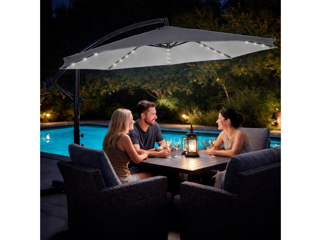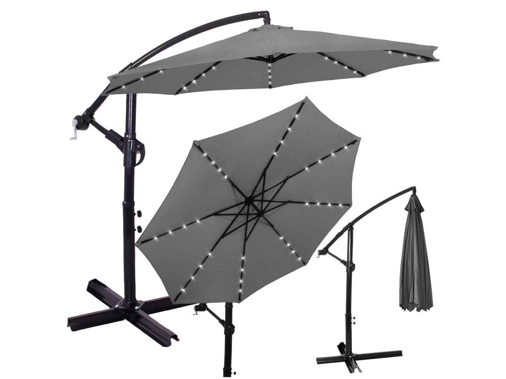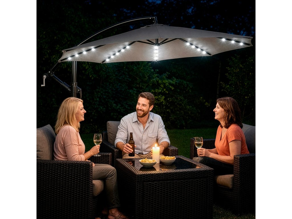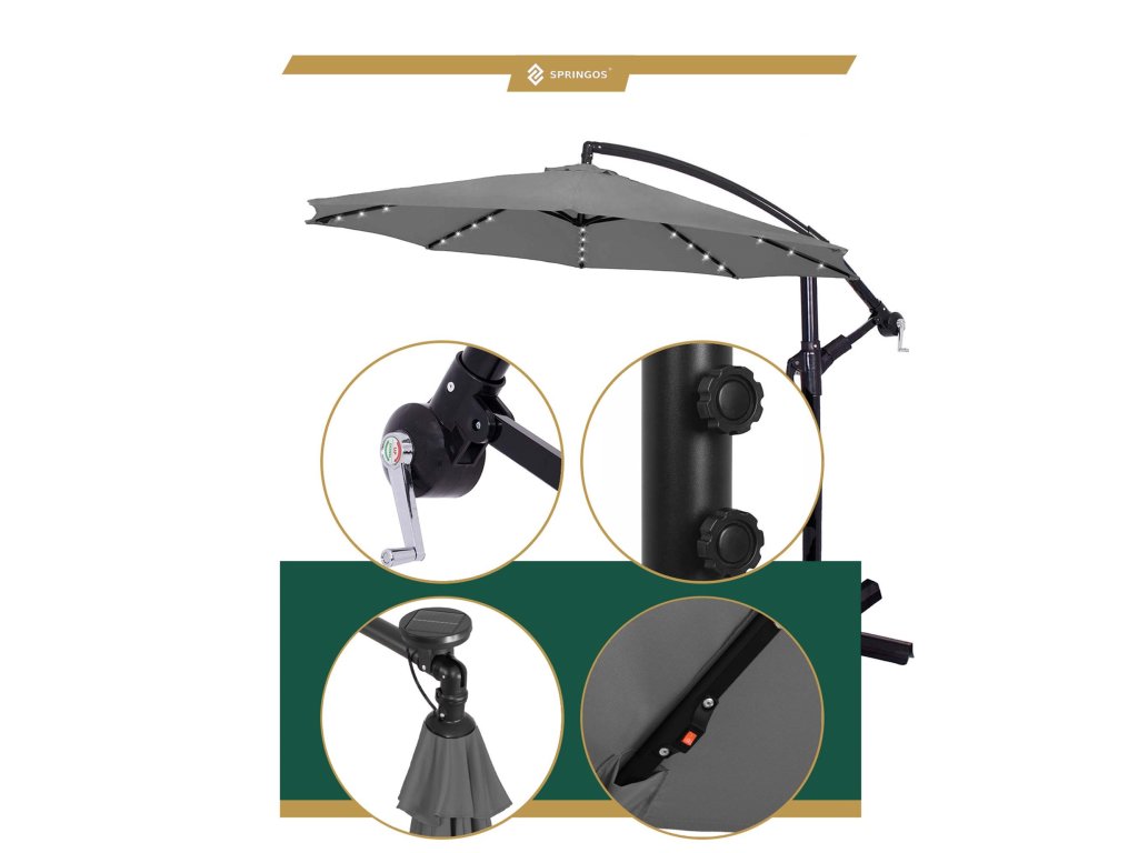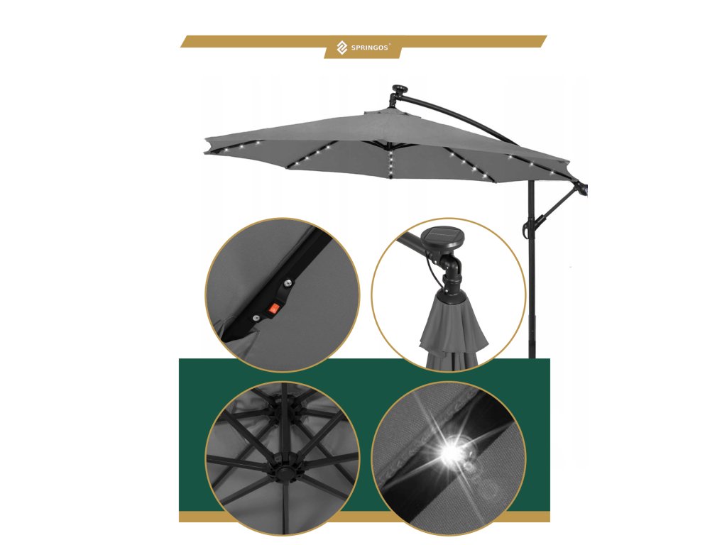 - Solárny panel pripevnený k dáždniku pomocou kábla, ktorý sa nachádza na špičke dáždnika