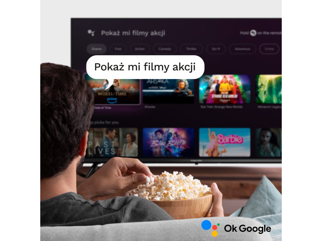 Televízor Kruger&Matz KM0250UHD-SA sa stane vaším sprievodcom pri hľadaní toho správneho obsahu. Stlačte tlačidlo hlasového vyhľadávania na diaľkovom ovládači a položte otázku alebo požiadajte o film, ktorý si chcete pozrieť, a odpovede dostanete priamo na obrazovke.