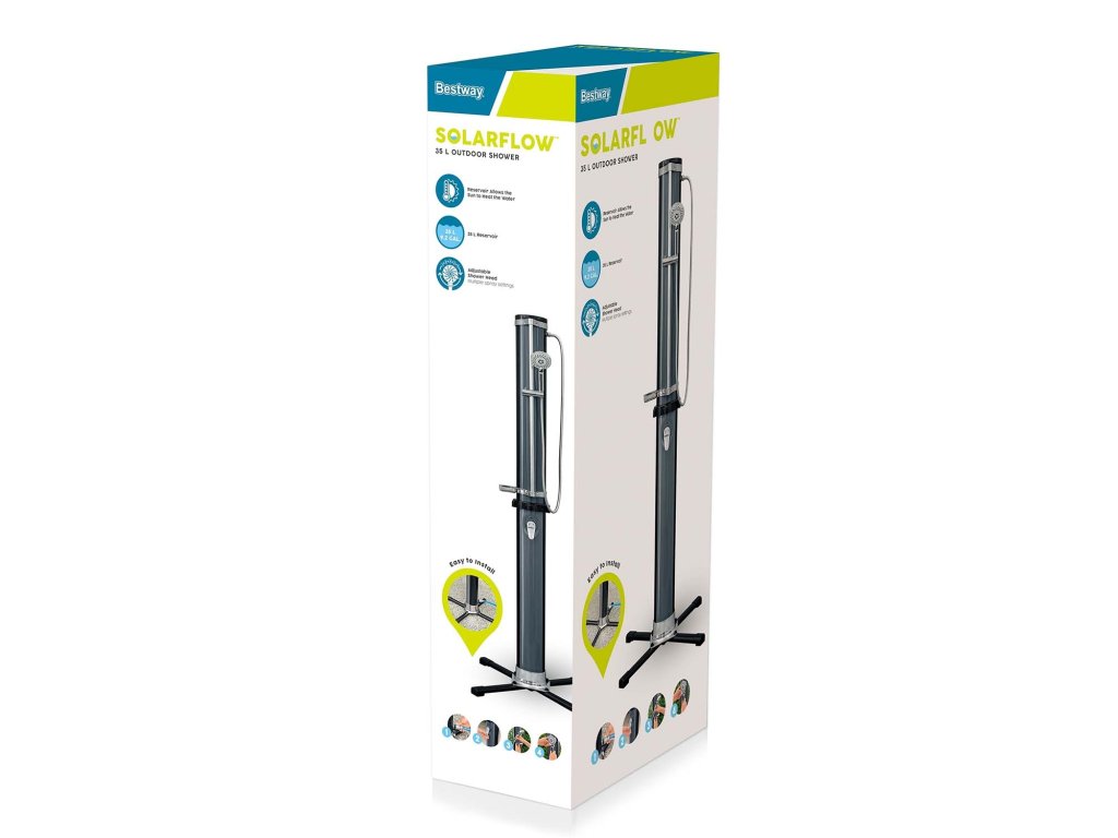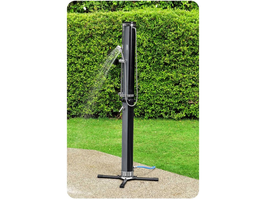 Navyše rezervoár vody pojme až 35 litrov vody, ktorú vďaka farbe a konštrukcii sprchy môžu zahriať slnečné lúče.
