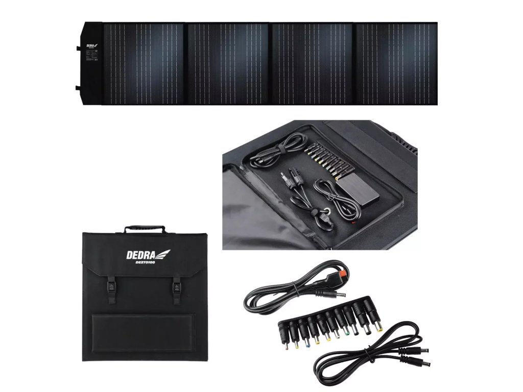Prenosný solárny panel DEZT0100 je produkt na nabíjanie elektrických staníc s výkonom do 1000 W, ako aj iných zariadení, napríklad tabletov a smartfónov.