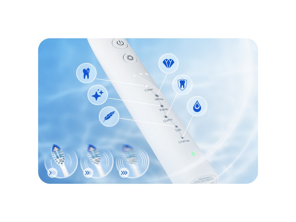 - GUMS – Režim starostlivosti o ďasná: špeciálne vyvinutý na jemnú masáž a zlepšenie zdravia ďasien.