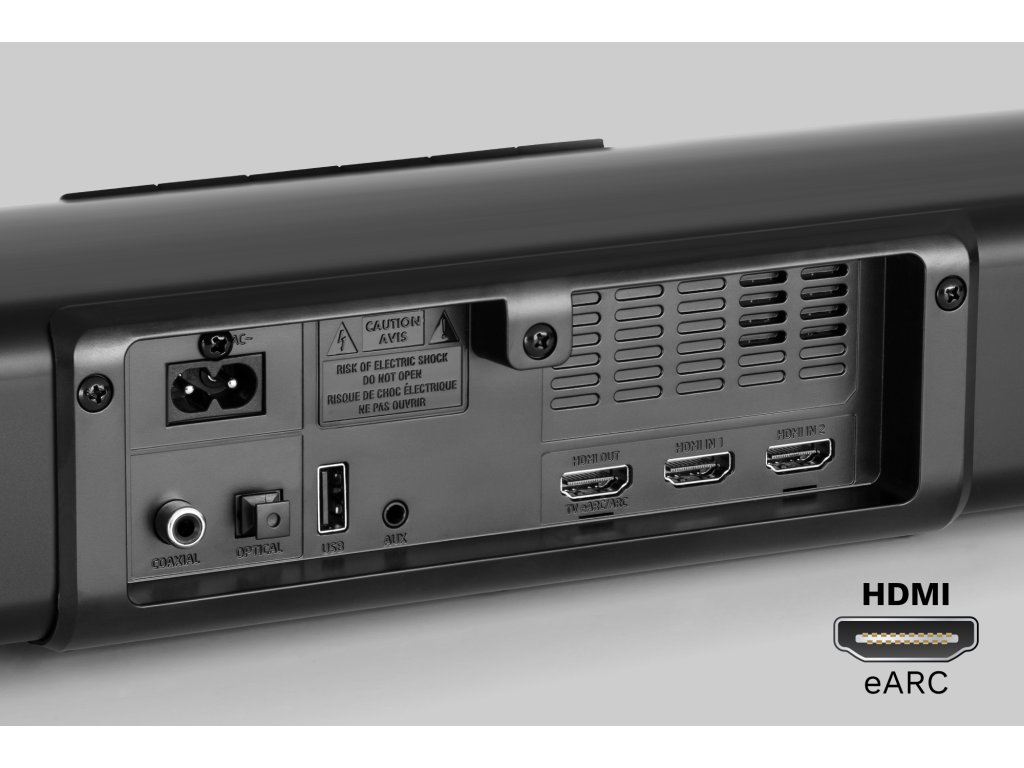 Vstupy/výstupy: Vstup 2x HDMI, výstup HDMI 2v1 (CEC / eARC / HDCP2.3), optický vstup, koaxiálny vstup, port USB, vstup AUX-in (3,5 mm jack)