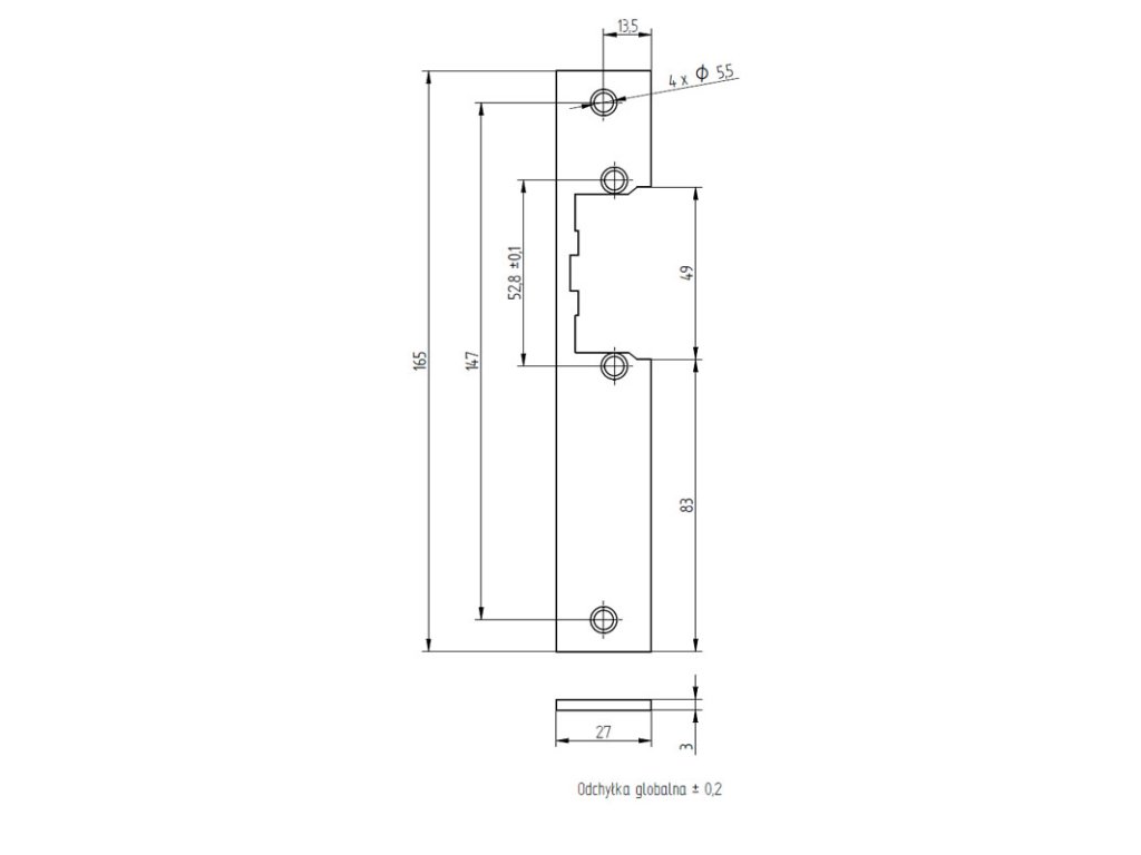 Umožňuje nahradenie elektromagnetického zámku typu R2 zámkom R3 alebo R4 spolu s týmto štítom bez potreby vŕtania ďalších otvorov. Prispôsobený pre ľavé aj pravé dvere. Štít je pokrytý práškovou vrstvou svetlej oceľovej farby.