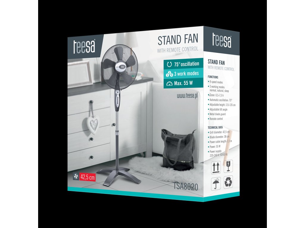 ZÁVAN ČERSTVÉHO VZDUCHU! A to všetko vďaka stojacemu ventilátoru Teesa! Výber z ôsmich rýchlostných režimov vám umožní prispôsobiť teplotu vašim potrebám. Veľký priemer vrtúľ poháňaných motorom s menovitým výkonom 55 W v kombinácii s automatickou osciláciou 75° uľahčuje ventilátoru ochladzovať väčšie miestnosti.