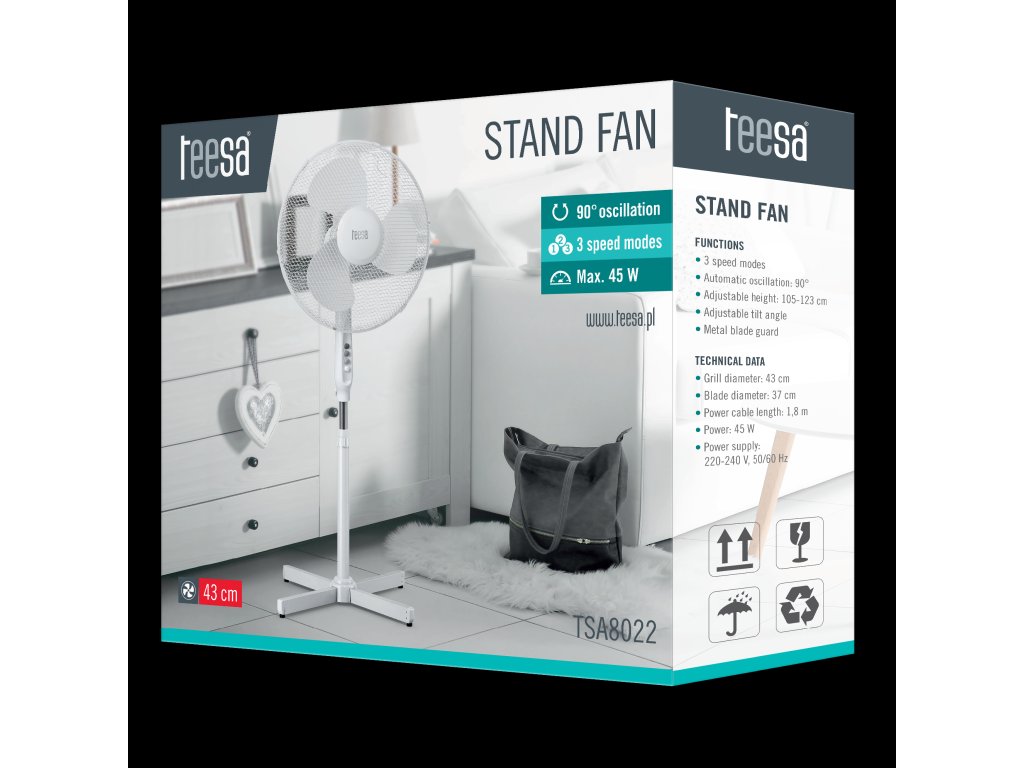 ZÁVAN ČERSTVÉHO VZDUCHU! A to všetko vďaka stojacemu ventilátoru Teesa! Výber z troch rýchlostných režimov vám umožní prispôsobiť teplotu vašim potrebám. Veľký priemer vrtúľ poháňaných motorom s menovitým výkonom 45 W v kombinácii s automatickou 90° osciláciou znamená, že ventilátor dokáže bez problémov ochladiť väčšiu miestnosť.Ventilátor Teesa znamená aj bezpečnosť vďaka kovovému krytu, ktorý obklopuje vrtule zariadenia. Medzi výhody zariadenia určite patrí aj nastaviteľná výška a možnosť zmeny uhla sklonu. Vyskúšajte ho ešte dnes a pocíťte chladivý vánok počas horúcich dní!