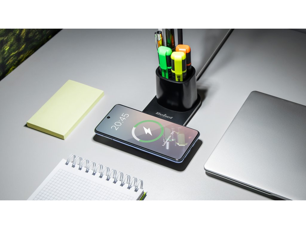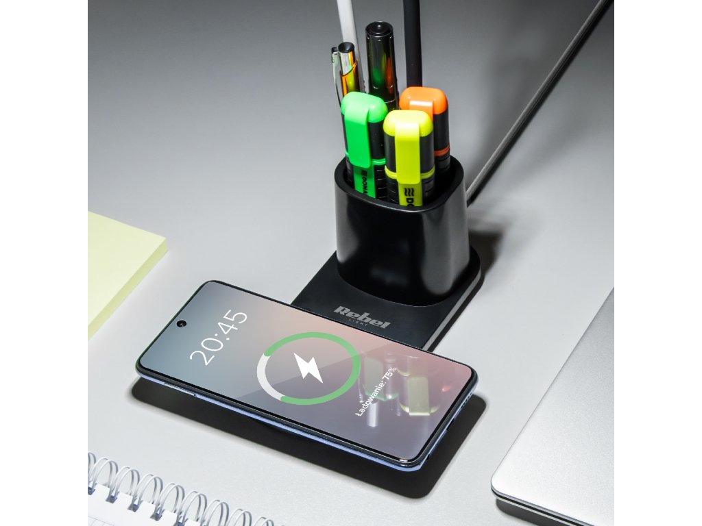 Ďalšou skvelou funkciou zariadenia je indukčná nabíjačka pre smartfóny vybavené bezdrôtovým nabíjaním. Stačí, ak telefón položíte na špeciálne označené miesto na lampe a zariadenie sa začne nabíjať.