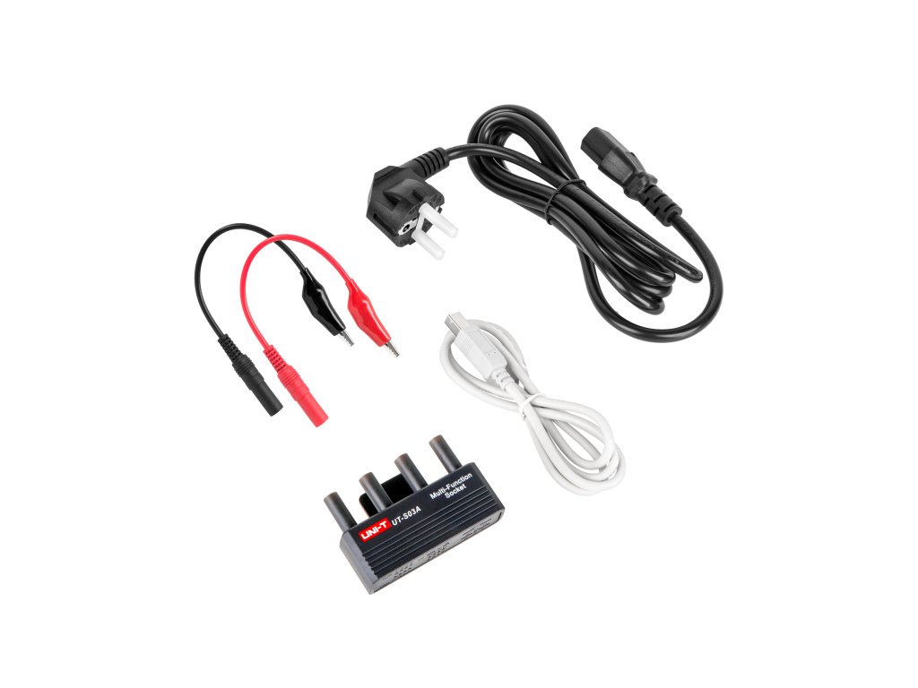 Príslušenstvo: sieťový kábel, USB kábel, testovacie káble, krátke káble s krokosvorkami, multifunkčná zásuvka
