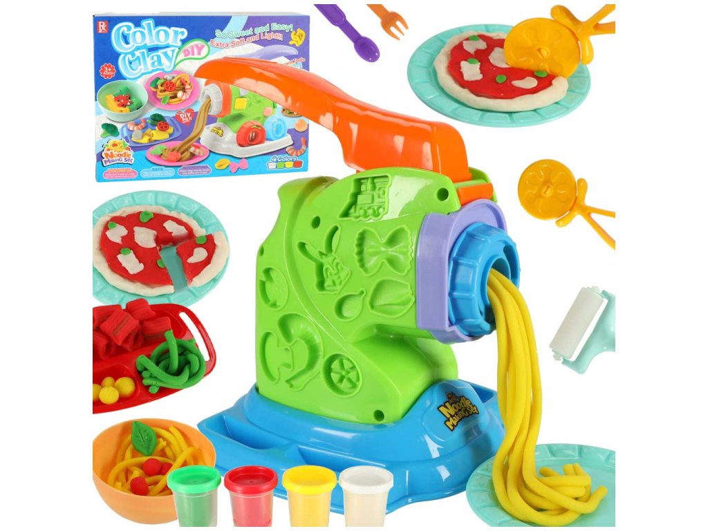 Obsahuje množstvo užitočného príslušenstva! Používa plastovú hmotu, ktorá je úplne bezpečná! Strojček na cestoviny Plastelína x4 (červená, žltá, biela, zelená) Náhradné nástavce x4 Tanier Miska Podnos Valčeky x2 Príbory Plast: plast, plastová hmota Vek používateľa: 3+ Strojek: 25 cm x 20 cm x 18 cm Obal: 30 cm x 23 cm x 8 cm Je čas začať variť! Strojček na cestoviny pre plastovú hmotu vám umožní vytvoriť mnoho krásnych jedál! Súprava obsahuje štyri nádoby na plastovú hmotu v rôznych farbách! Dôležité je, že je pre vaše dieťa úplne bezpečná a ľahko sa používa!
