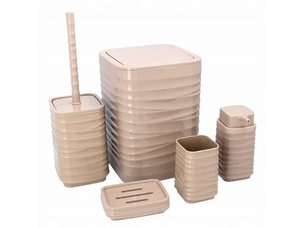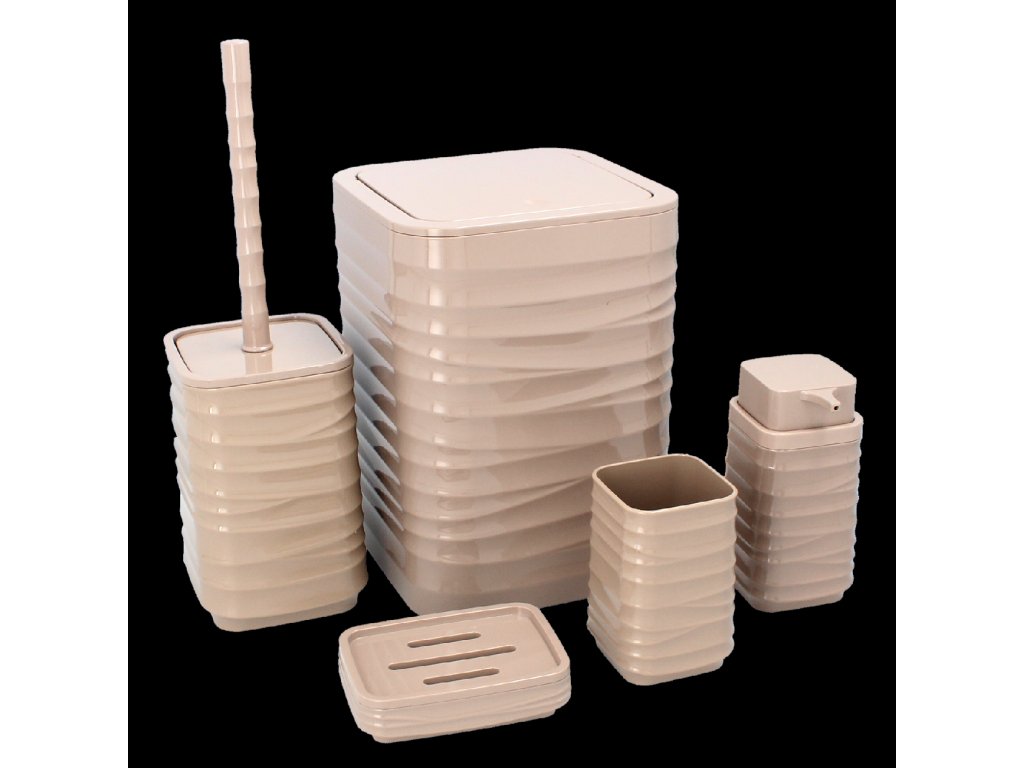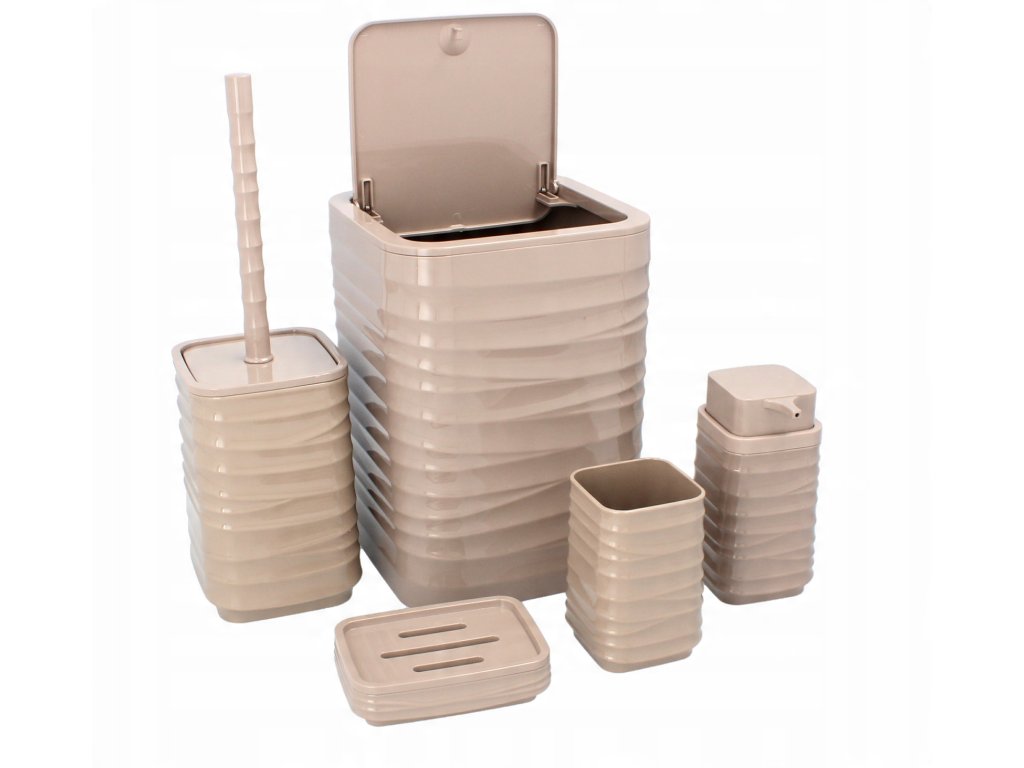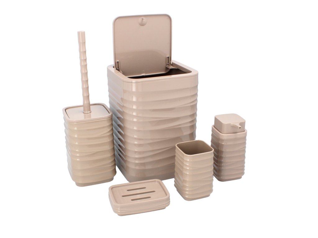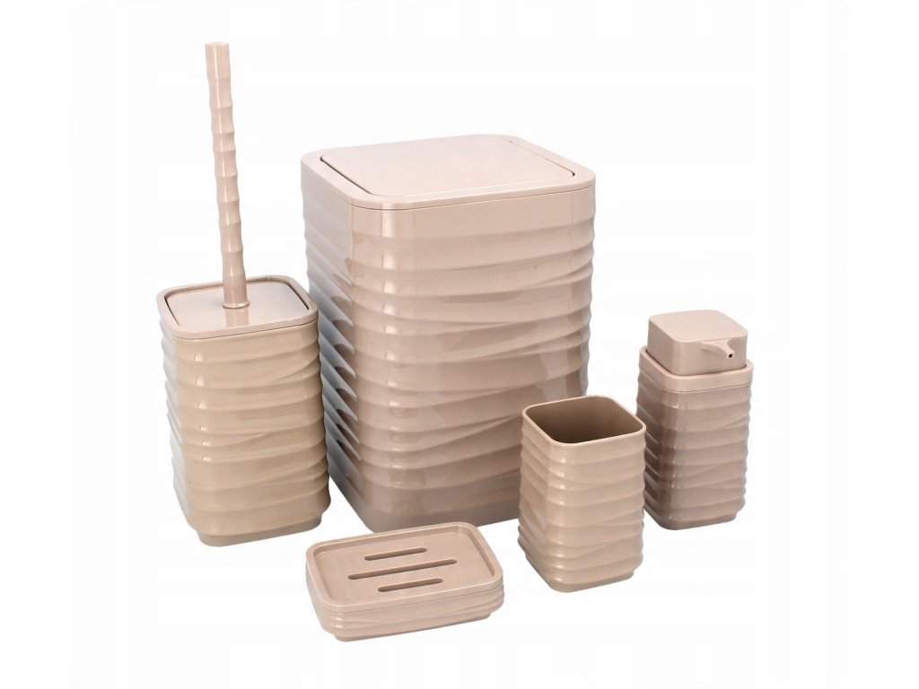 Súprava do kúpeľne 5-dielna štvorcová v hnedej farbe, vyrobená z plastu.Súprava obsahuje: