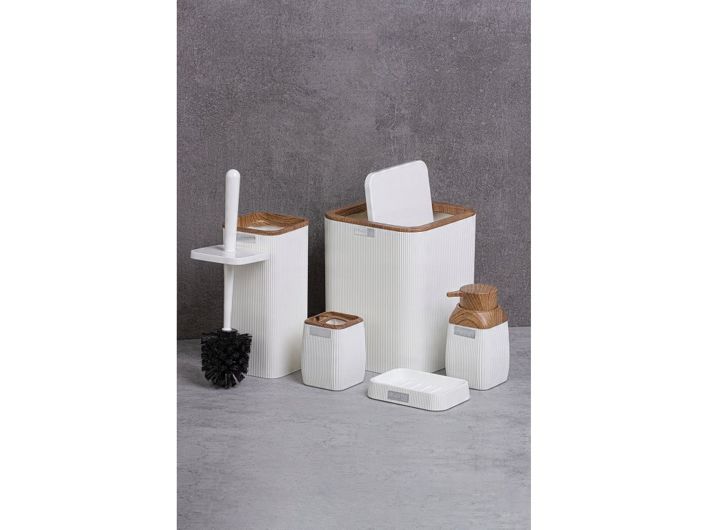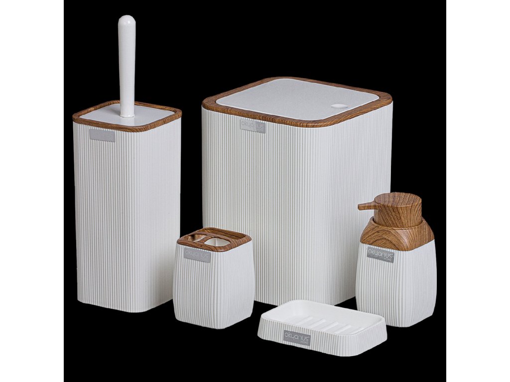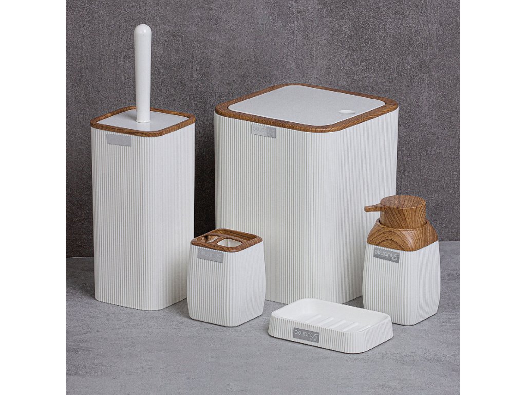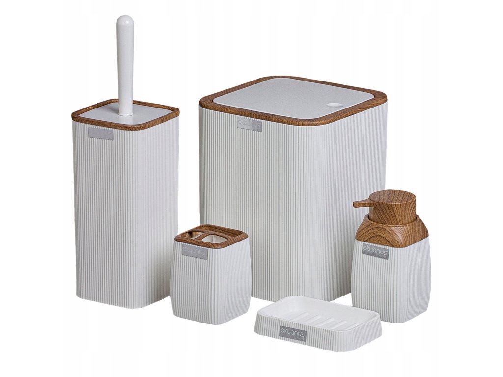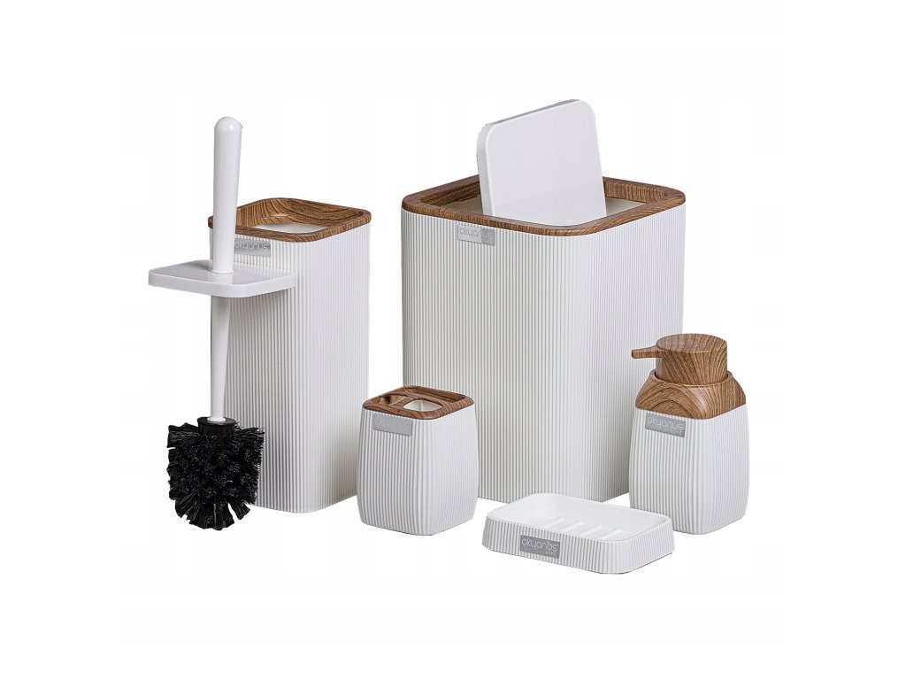 Set kúpeľňových doplnkov 5-dielny štvorcový v bielej farbe s povrchovou úpravou napodobňujúcou drevo vyrobený z plastu.V súprave sa nachádza: