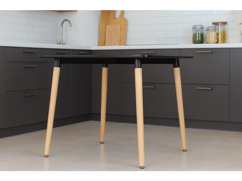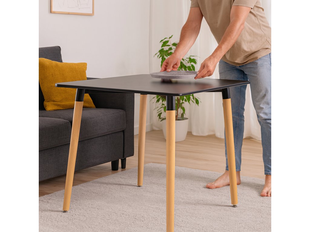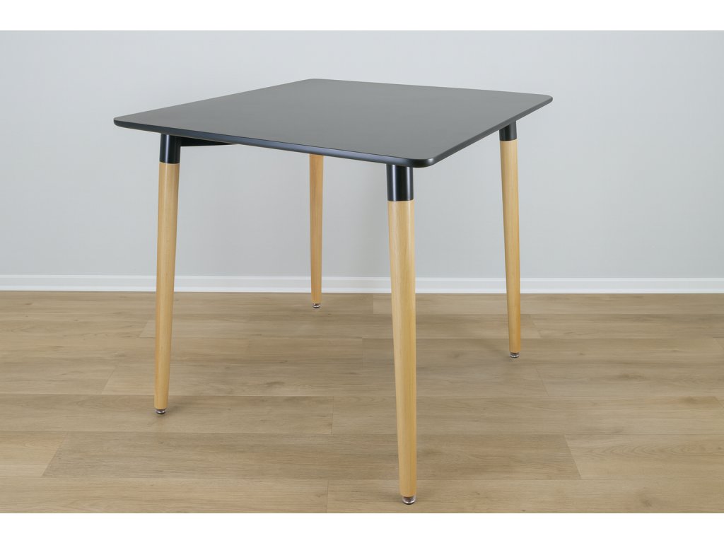 Moderný čierny štvorcový stôl 80x80x74 cm s pevnou konštrukciou z bukového dreva a ## plastu ##. Ideálny do jedálne, kuchyne, kancelárie alebo kaviarne. Elegantný, trvácny a ľahko udržiavateľný.