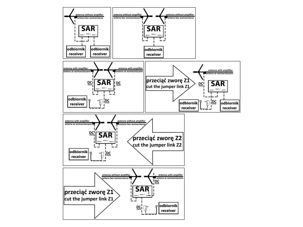Upozornenie! V prípade napájania zosilňovača len jednej z antén je potrebné prestrihnúť prepojku (Z1 alebo Z2) v obvode