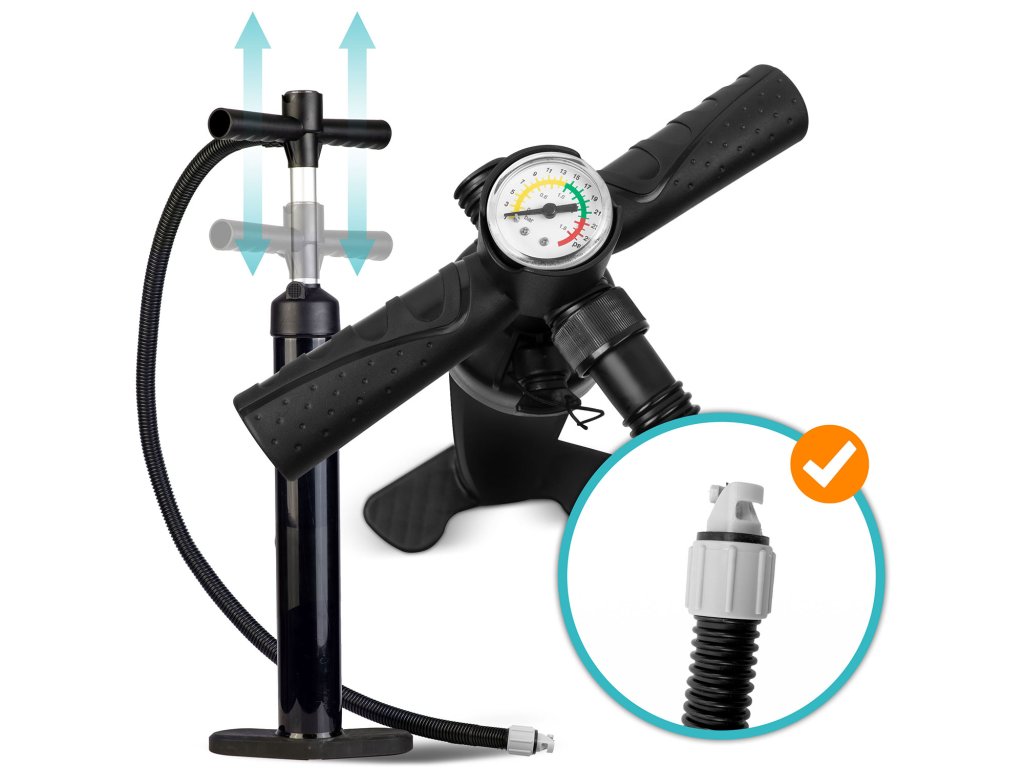 Obojstranné pumpovanie – fúka vzduch aj pri stlačení, aj pri zdvihnutí pístu – rýchlejšie napumpuješ paddleboard.