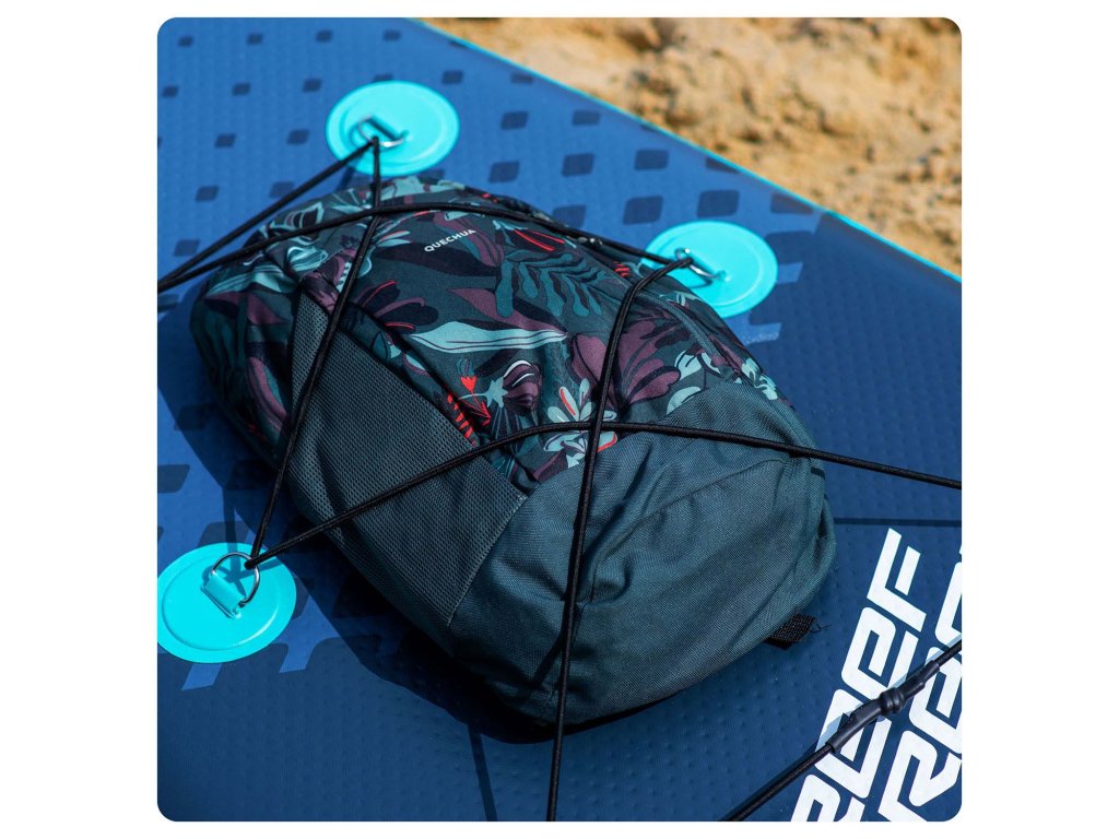 Batoh, mikina, nápoj Vlož pod pružné pásky a plávaj na cestu! Elastická sieť vpredu paddleboardu je praktické miesto pre tvoju výbavu.