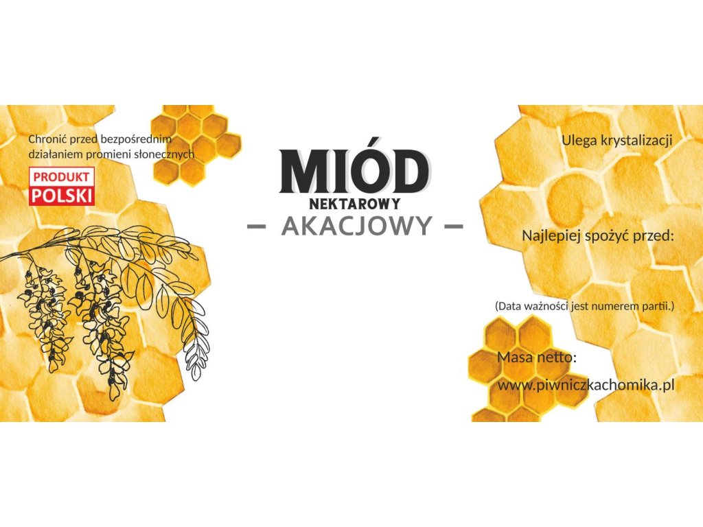 Súprava etikiet určených na agátový nektárový med. Súprava sa skladá zo 100 kusov etikiet. Vďaka etikete bude môcť spotrebiteľ identifikovať druh medu a dátum spotreby.Rozmery:
