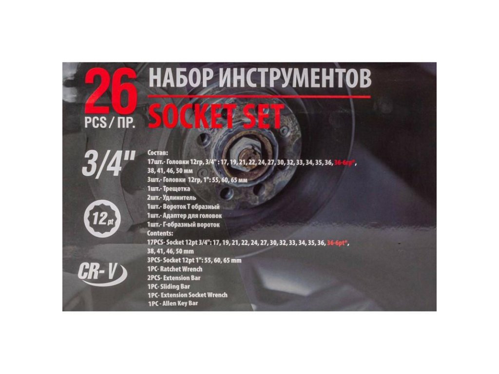 - Nástavce 12-hranné 3/4" - 17 ks: 17 mm, 19 mm, 21 mm, 22 mm, 24 mm, 27 mm, 30 mm, 32 mm, 33 mm, 34 mm, 35 mm, 36 mm, (36 mm - 6-hranné), 38 mm, 41 mm, 46 mm, 50 mm