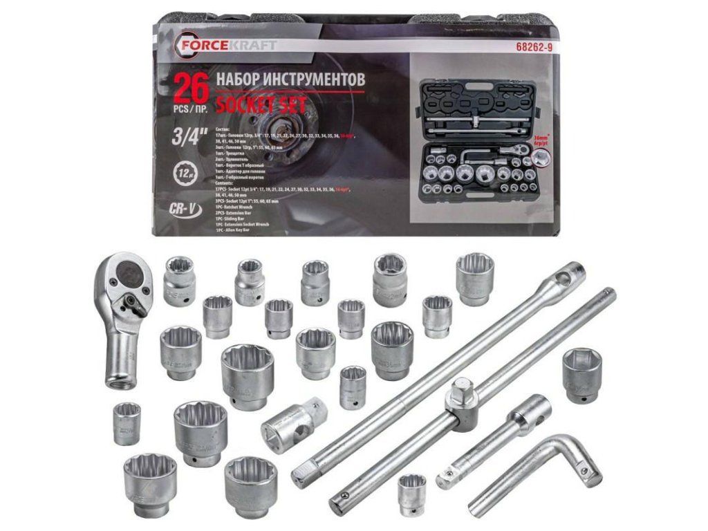 Súprava obsahuje 26 prvkov. Všetky nástavce a prechodky sú umiestnené v praktickom plastovom kufri, ktorý zaručuje bezpečný transport, bez možnosti samovoľného otvorenia.