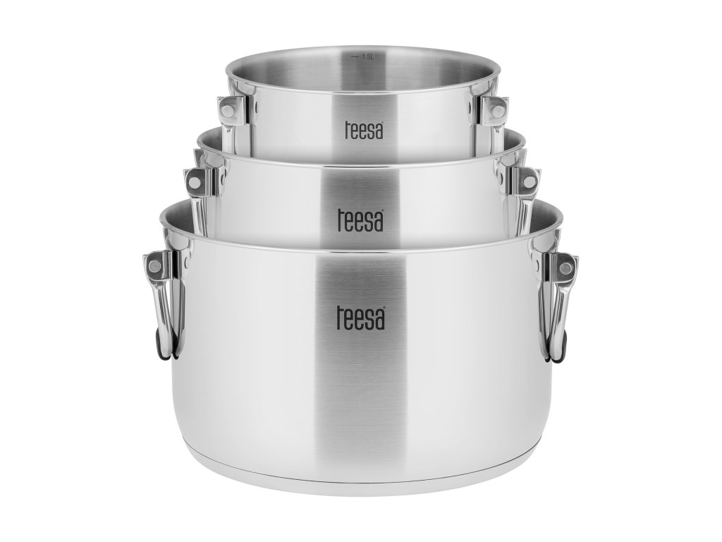 Sada hrncov Teesa bola navrhnutá s ohľadom na pohodlie a úsporu miesta. Premyslená konštrukcia s nitovanými, skladacími rukoväťami je skutočná spása nielen v malých kuchyniach. Koniec neporiadku v skrinkách a večného hľadania pokrievky na príslušný hrniec. Vďaka možnosti vkladať jeden hrniec do druhého ušetríte cenné miesto vo svojej kuchyni.