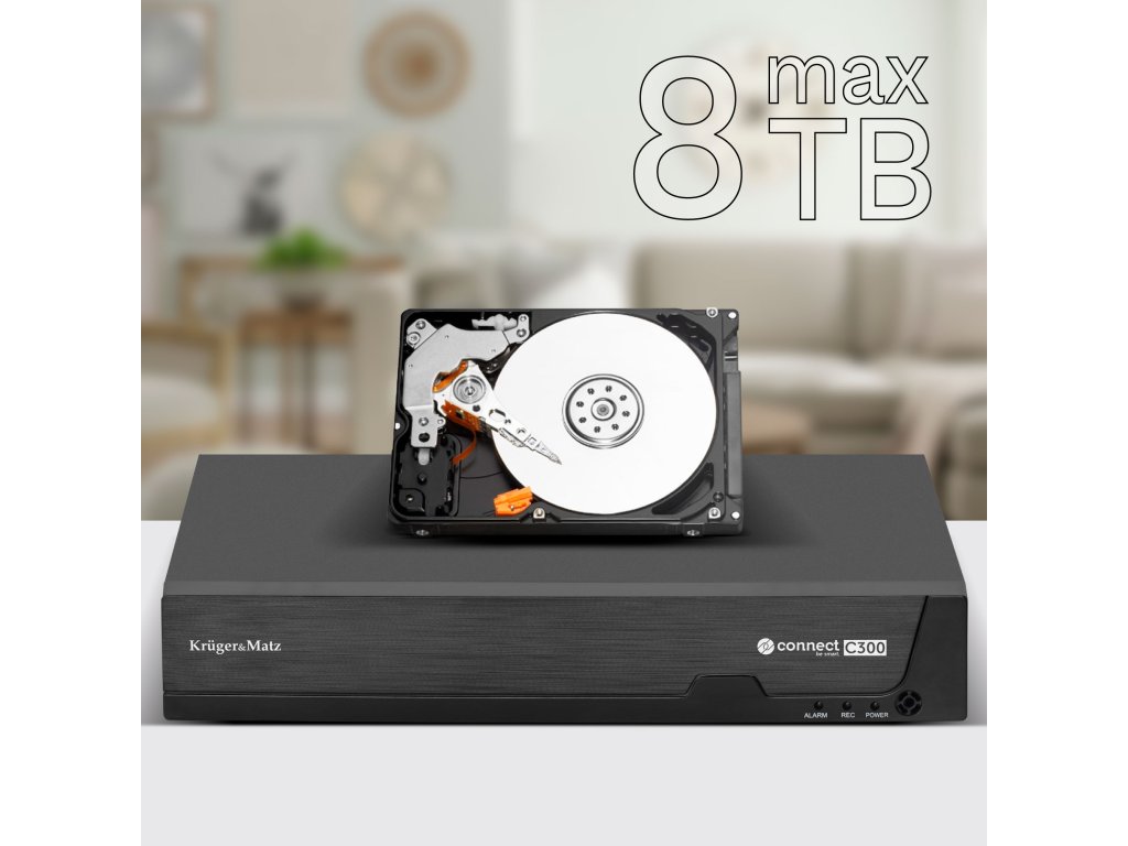 Dobrá pamäťRekordér v súprave podporuje disky s maximálnou kapacitou 8 TB. Táto kapacita vám vystačí dokonca na mesiac nahrávok vo vysokej kvalite. Vďaka monitorovaciemu systému Kruger&Matz Connect C200 vám nič neunikne.