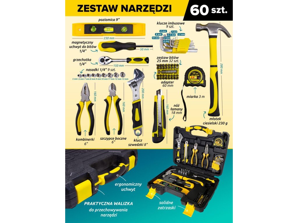 Komplet náradia bol vyvinutý s ohľadom na potreby každého domáceho majstra aj profesionálneho "zlatého ručičku". Nástroje, ktoré sú v ňom umiestnené, umožňujú rýchlu, efektívnu prácu ako doma, tak i v dielni. Funkčná súprava náradia obsahujúca najviac užitočné nástroje, nevyhnutné v každej domácnosti alebo dielni.
