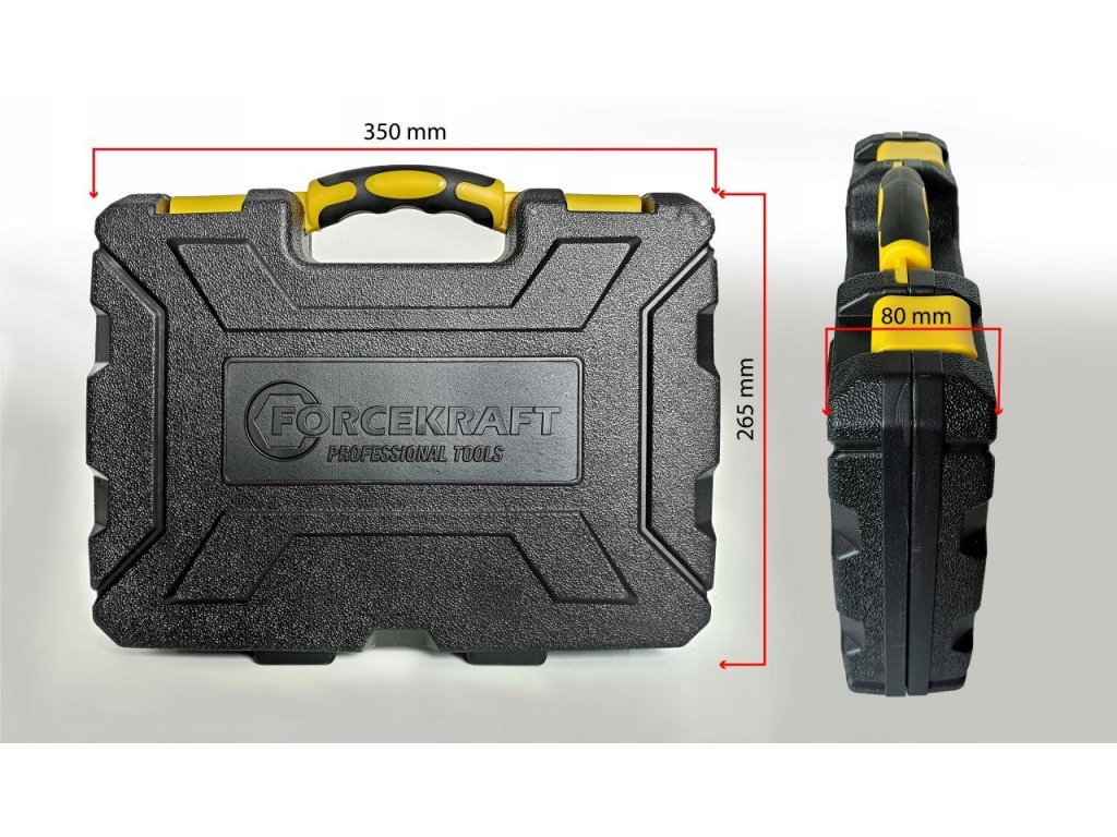 Celé náradie je umiestnené vo veľmi odolnom a ergonomickom kufríku z plastu, ktorý umožňuje ľahké prenášanie a skladovanie súpravy.