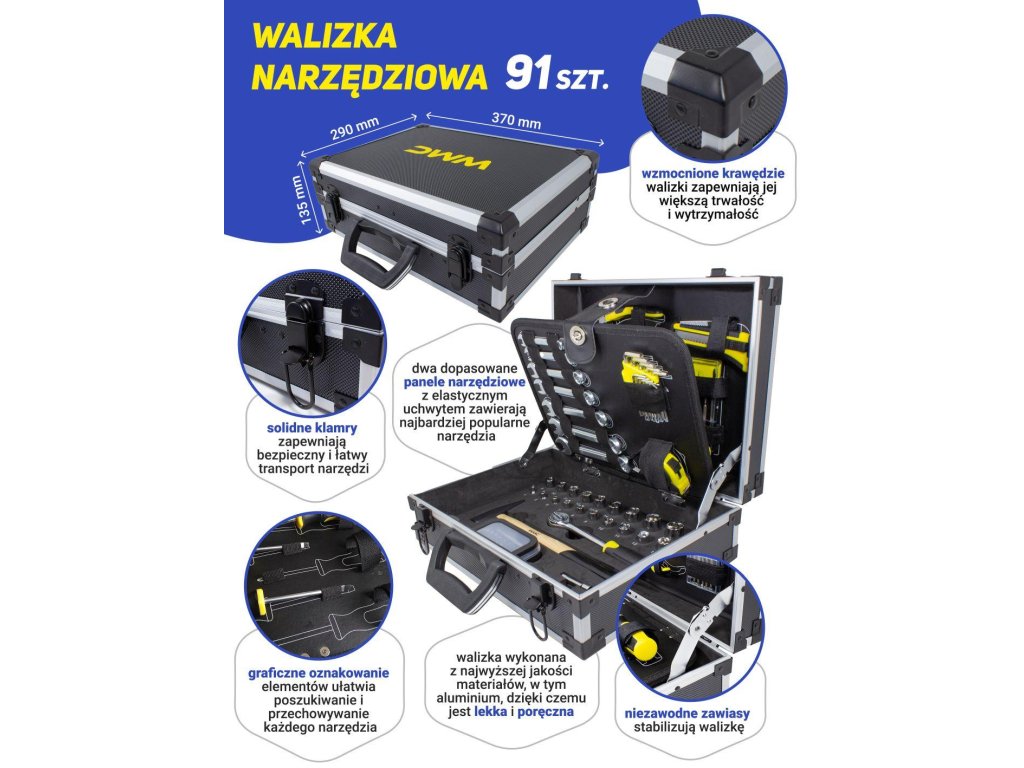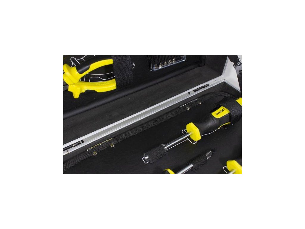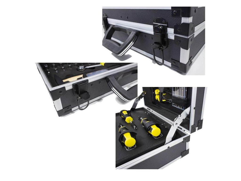 Kufor je vybavený pevnými a spoľahlivými sponami, čo zaisťuje bezpečný a ľahký prevoz náradia.