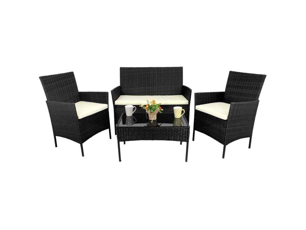 SÚPRAVA RATTANOVÉHO NÁBYTKU (SOFA, 2 KRESLÁ, STÔL) ČIERNA + KRÉMOVÁ.