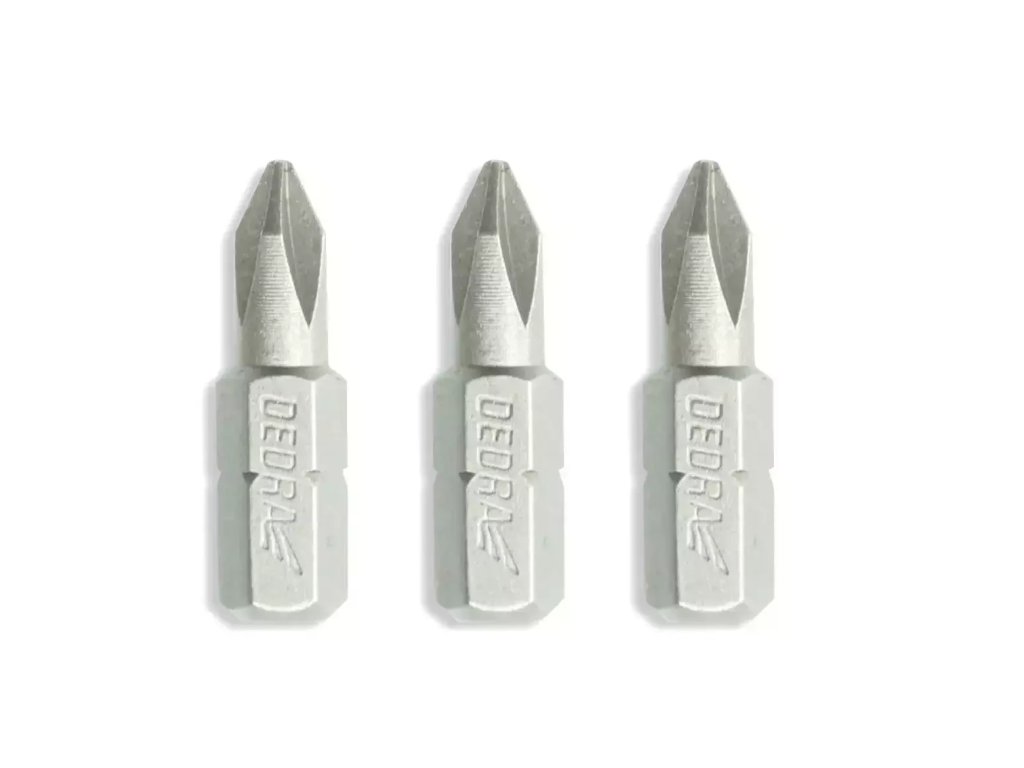 Sada skrutkovacích bitov PH1/ PH2/ PH3. Bity sú vyrobené z ocele S2, ktorá sa vyznačuje vysokou tvrdosťou a odolnosťou voči nárazom. Vďaka správnemu chemickému zloženiu a tepelnému spracovaniu si bity dlhodobo zachovávajú svoje vysoké pevnostné vlastnosti.