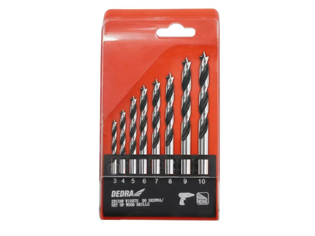 Veľkosť zobrazená nafotografii je príklad.Sada vrtákov vhodných na vŕtanie do všetkých druhov dreva. Vrtáky sa vyznačujú ostrým hrotom, ktorý umožňujeveľmi presné vyvŕtanieo t v o r u bez potrebyp r e d v ŕ t a n i a . Špeciálny tvar drážky uľahčuje manipuláciu a odoberanie triesky, vďaka čomu je vŕtanie rýchlejšie a efektívnejšie. Všetko v praktickom a funkčnom balení.