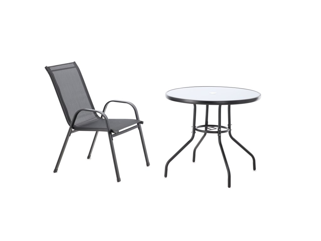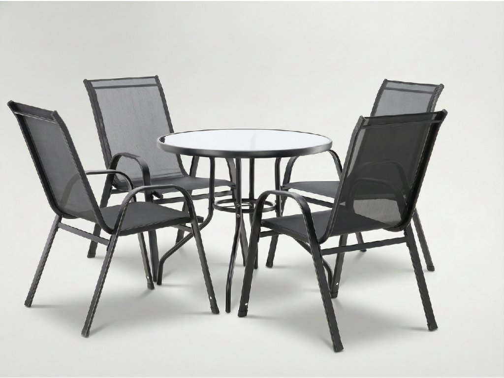 Súprava záhradného nábytku v čiernej farbe, pozostávajúca zo štyroch pohodlných stoličiek a elegantného, okrúhleho stola so sklenenou doskou. Vďaka pevnej konštrukcii a trvácnym materiálom sa súprava perfektne hodí do záhrady, na balkón alebo terasu. Moderný vzhľad a pohodlie pri používaní z neho robia ideálnu voľbu na letnú sezónu.