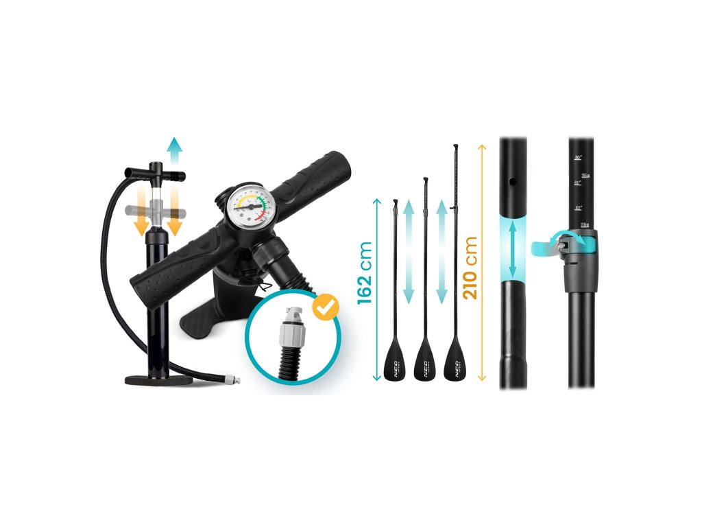 Kompletná súprava — súčasťou balenia je pádlo, pumpa, surf leash a batoh.