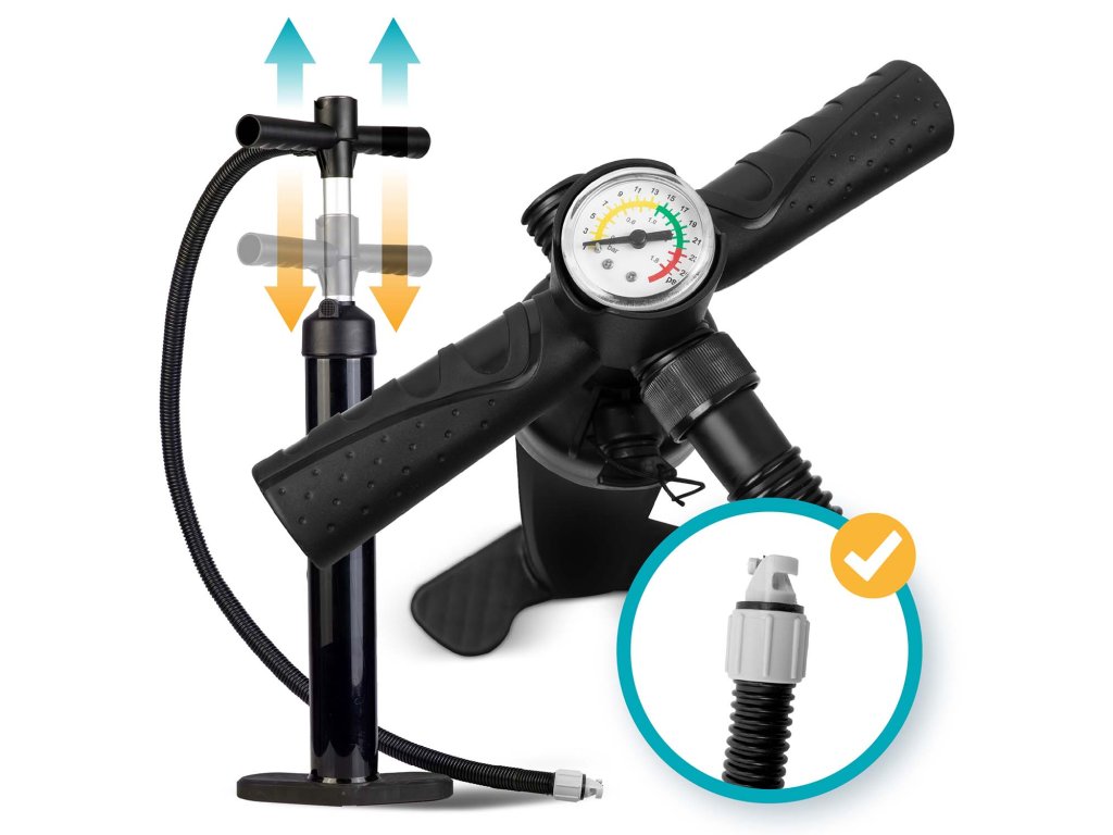 Obojsmerné pumpovanie — tlačí vzduch pri stlačení aj zdvíhaní piesta – rýchlejšie nafúknete dosku.