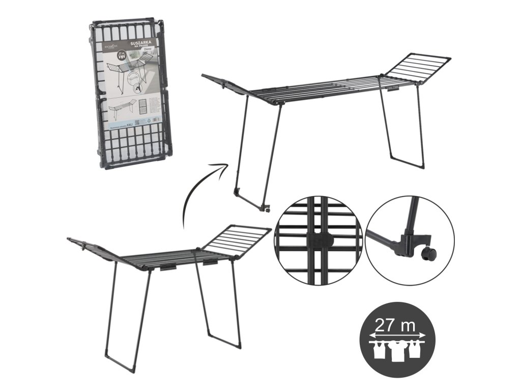 Praktický sušiak na bielizeň "DIANA" s dvoma ďalšími vešiakmi na ponožky, vyrobený z uhlíkovej ocele s práškovým nástrekom v matnej čiernej farbe. Nastaviteľná dĺžka umožňuje prispôsobenie rôznym priestorom.