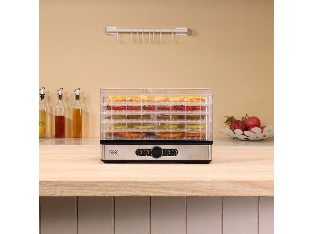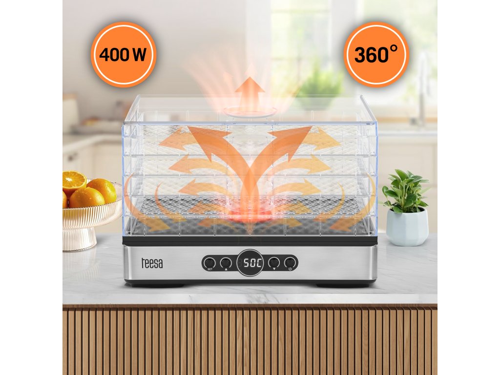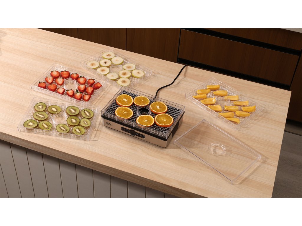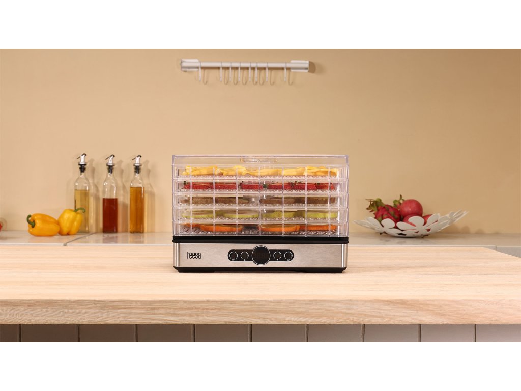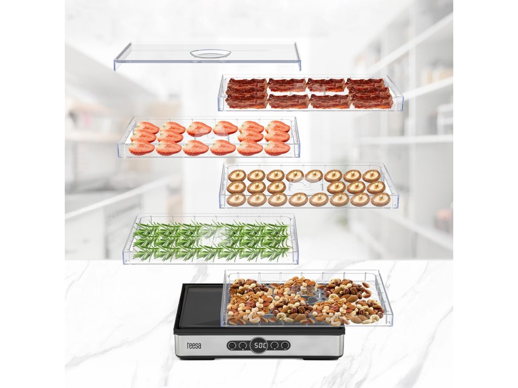 Sušička Teesa ponúka až 5 veľkých, priehľadných sít, ktoré pojmú celkovo do 1,7 kg produktov. Priehľadné tácky umožňujú kontrolu sušenia bez nutnosti otvárania zariadenia, čo zabezpečuje stálu teplotu a efektívnosť.