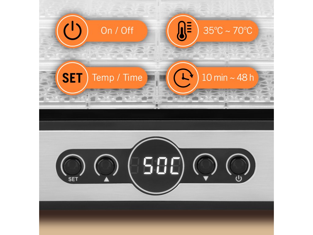 Presné nastavenie teploty umožňuje prispôsobiť proces sušenia rôznym druhom produktov, od jemných bylín po huby a ovocie. Časovač do 48 hodín zaručuje flexibilitu a pohodlie počas dlhodobého sušenia.