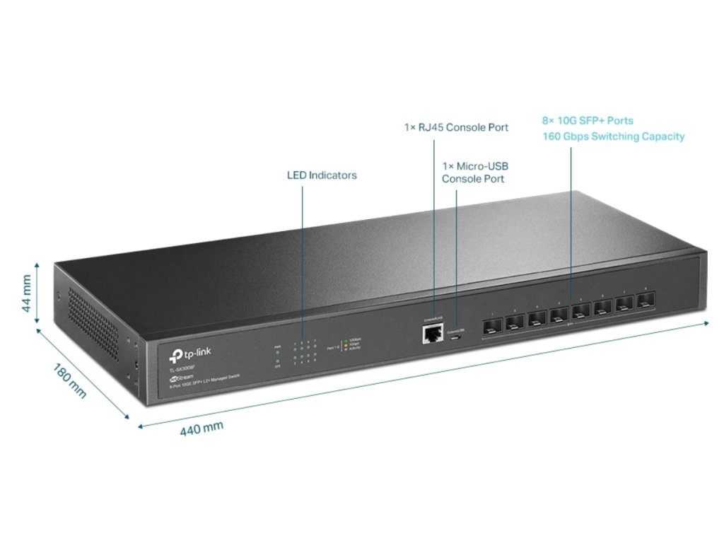 TP-Link SX3008F je pokročilý prepojovač správny L2+ zo série JetStream, vybavený 8 portami 10G SFP+. Zariadenie bolo navrhnuté s cieľom zabezpečiť vysoký výkon, flexibilitu a bezpečnosť v správe siete, čo z neho robí ideálne riešenie pre stredné a veľké podniky.