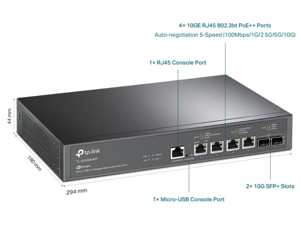 TP-Link SX3206HPP je pokročilý prepináč spravovaný L2+ zo série JetStream, vybavený 6 portami 10G, vrátane 4 portov PoE++ RJ45 a 2 slotov SFP+. Zariadenie bolo navrhnuté s cieľom zabezpečiť vysoký výkon, flexibilitu a bezpečnosť v správe siete, čo z neho robí ideálne riešenie pre stredné a veľké podniky.