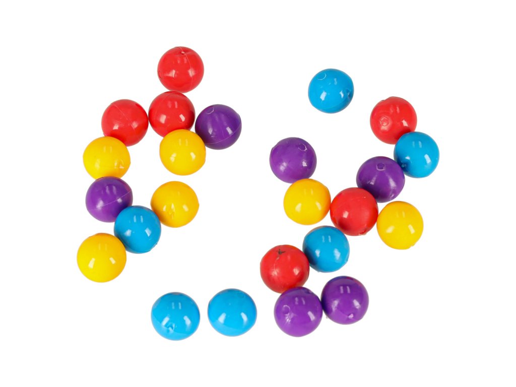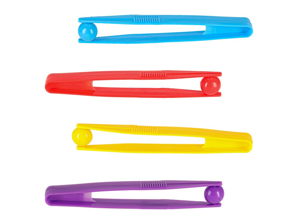 farba loptičiek a pinzety: žltá, červená, fialová, modrá